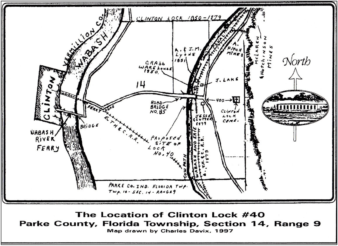 Clinton, Indiana, chose not to build a side-cut canal but to utilize the ferry to cross the Wabash and follow the existing ferry road to Hudnut (Lyford) where John Crab had built a warehouse beside the mainline canal. Here the canal boats could be loaded and unloaded. To the south of Crabb’s warehouse was Lock No. 40 that was appropriately called Clinton Locks.