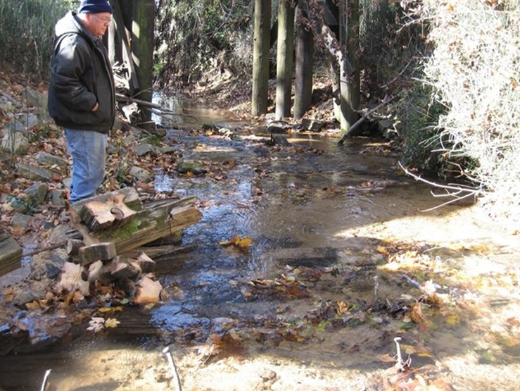 Luckily, November 12 turned out to be a beautiful day. My wife Jo and I left home around 8:30 a.m. and met Chuck at his house in less than 2 hours. We travelled to the farm of Darrel, the property owner. He escorted us out to the railroad trestle, which sits about 20 feet above a creek. Walking out on the trestle and looking down into the clear, shallow water, one can see timbers. These timbers are large, and their widths are not uniform. I knew right away that these timbers were not part of the railroad. I could see they were older than any of the railroad timbers in the area. We drove down to the creek where Darrel and I put on boots and waded through the water to the location of the timbers. We found the sidewall timbers buried in silt. There were large rocks in and around the creek bed. The rocks looked like ones used to protect a canal structure. I came to the conclusion that this was the remains of a Wabash & Erie Canal culvert . The setting for this structure is on the edge of the bluffs of the West Fork of the White River in Daviess County.