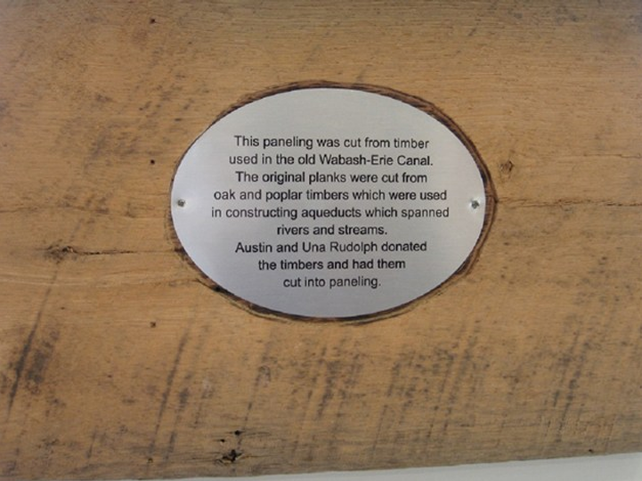 Chuck suggested we visit the Pike County Public Library because it contained some canal-related items. The facility itself is fairly new. At the library, the Special Collections Librarian and Chuck pointed out that one wall and part of the ceiling in one room are covered with wood planking, which was donated by the Rudolph family. It was cut from the timbers of a Wabash & Erie Canal structure that was on their property. This display made a very attractive background for this part of the library. There is a plaque on the wall stating the following: “This paneling was cut from timber used in the old Wabash-Erie Canal. The original planks were cut from oak and poplar timbers, which were used in constructing aqueducts that spanned rivers and streams. Austin and Una Rudolph donated the timbers and had them cut into paneling.”